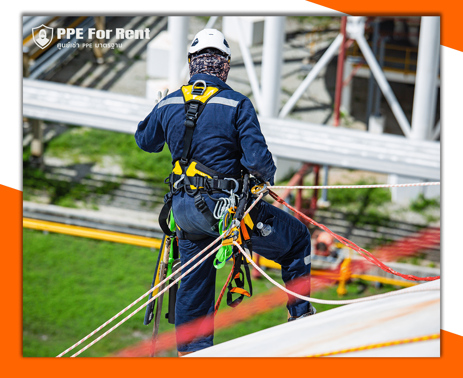 อุปกรณ์ความปลอดภัยที่ใช้สำหรับการทำงานบนที่สูง ประกอบด้วยสายรัดตัวเต็มรูปแบบ (Full Body Harness), เชือกนิรภัย, คาราบิเนอร์ และอุปกรณ์กันตก เพื่อป้องกันการพลัดตกและลดความเสี่ยงจากอุบัติเหตุ