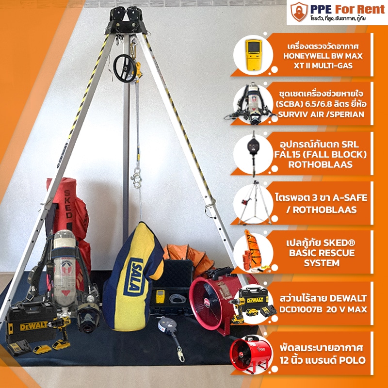 เซตอุปกรณ์อับอากาศ Set 3 ครบชุด พร้อม SCBA , เครื่องตรวจวัดแก๊ส Honeywell BW Max XT II Multi-Gas , ไตรพอด , Rollgliss R550 , พัดลม 12 นิ้ว , เปลกู้ภัย และ SRL FAL15 เหมาะสำหรับงานบ่อพัก ถังเก็บ และพื้นที่แคบที่ต้องมีระบบกู้ภัยครบวงจร